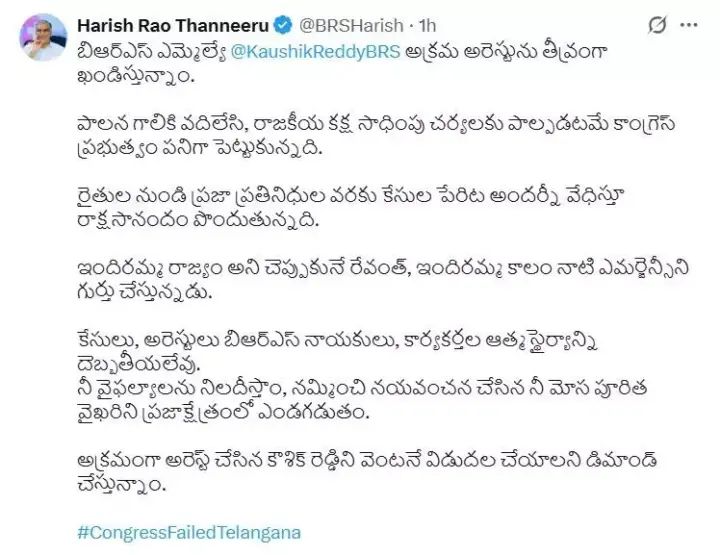 ఈ కేసు నేపథ్యంలో శనివారం తెల్లవారుజామున ఎమ్మెల్యే కౌశిక్ రెడ్డి (MLA Kaushik Reddy)ని శంషాబాద్ ఎయిర్ పోర్టులో సుబేదారి పోలీసులు అరెస్ట్ చేశారు. అక్కడి నుంచి వరంగల్‌లోని సుబేదారి పోలీస్ స్టేషన్ (Subedari Policestation)కు తరలించారు. మరికొద్ది సేపట్లో ఆయనను కోర్టులో హాజరు పరిచే అవకాశం ఉన్నట్లు తెలుస్తోంది. కాగా కౌశిక్ రెడ్డి అరెస్టును బీఆర్ఎస్ నేతలు తీవ్రస్థాయిలో ఖండిస్తున్నారు. ఇందులో భాగంగా మాజీ మంత్రి హరీష్ రావు.. ఎమ్మెల్యే కౌశిక్ రెడ్డి (MLA Kaushik Reddy) అక్రమ అరెస్టును తీవ్రంగా ఖండిస్తున్నట్లు ప్రకటించారు.ఈ సందర్భంగా తన ఎక్స్ ఖాతాలో ట్వీట్ చేసిన ఆయన.. ఇలా రాసుకొచ్చారు. “రాష్ట్రంలో పాలనను గాలికి వదిలేసి, రాజకీయ కక్ష సాధింపు చర్యలకు పాల్పడటమే కాంగ్రెస్ ప్రభుత్వం పనిగా పెట్టుకున్నది. రైతుల నుంచి ప్రజా ప్రతినిధుల వరకు కేసుల పేరిట అందర్నీ వేధిస్తూ రాక్షసానందం పొందుతున్నది. ఇందిరమ్మ రాజ్యం అని చెప్పుకునే రేవంత్, ఇందిరమ్మ కాలం నాటి ఎమర్జెన్సీని గుర్తు చేస్తున్నడు. కేసులు, అరెస్టులు బిఆర్ఎస్ నాయకులు (Leaders of BRS), కార్యకర్తల ఆత్మస్థైర్యాన్ని దెబ్బతీయలేవు. ప్రభుత్వ వైఫల్యాలను నిలదీస్తాం, నమ్మించి నయవంచన చేసిన ప్రభుత్వ మోసపూరిత వైఖరిని ప్రజాక్షేత్రంలో ఎండగడుతం. అక్రమంగా అరెస్ట్ చేసిన కౌశిక్ రెడ్డిని వెంటనే విడుదల చేయాలని డిమాండ్ చేస్తున్నాం.” అని హరీష్ రావు రాసుకొచ్చారు.
